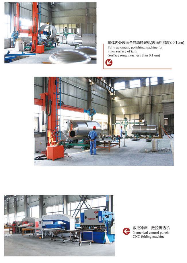 主要制造设备:数控剪板机、数控等离子封头切割坡口机(进口正在洽谈)、焊接机器人(进口正在洽谈)、数控铣边机(进口)、卷板机、数控激光焊接机(进口)、数控全自动管焊机、全自动切管坡口机、数控冲床、数控折弯机、数控车床、普通车床、全自动抛光机、线切割等。