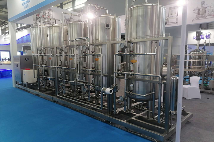 ● 原水->原水泵->多介质过滤器->活性炭过滤器->软化过滤器->保安过滤器->一级高压泵->一级反渗透->中间水箱->二级高压泵->二级反渗透->纯水箱->纯水泵->紫外线杀菌器->保安过滤器->用水点。