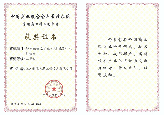 热烈庆祝我公司的“微生物液态发酵先进测控技术与装备”项目荣获全国商业科技进步“二等奖”