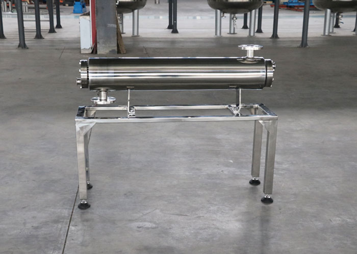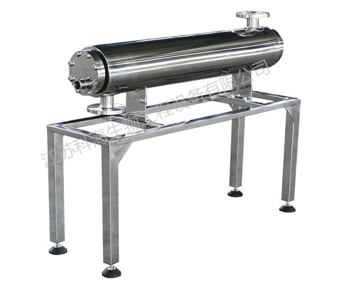 1.由两个管箱、涨焊双管板式换热器壳体、多组换热管、ASME卫生型快开式接头(管程)、HG20592法兰接口(壳程)、壳体外部不锈钢SUS304保温层、两个管式支腿等组成。换热面积大于1.0㎡以上的换热器为了增加换热器的传热效果,利用隔板将管程分隔为多程(2~3程),使水在管程内流速增大,管内水的流速维持在2~3m/s。按照全逆流热交换的原理,液体介质(或冷介质)走管程, 气体介质(或热介质)走壳程。本机使用为卧式放置。本机使用的材质为:凡和管程及壳程接触的过流材质均为316L(00Gr17Ni14MO2),其余支腿和保温外壳等材质为SUS304,密封材质为:聚四氟乙烯(PTFE)。整机全部采用不锈钢制造。本机全部采用洁净式设计,管程抛光精度为Ra≤0.4um双管板涨焊结构,设计结构保证可以排净冷凝器内的余水。